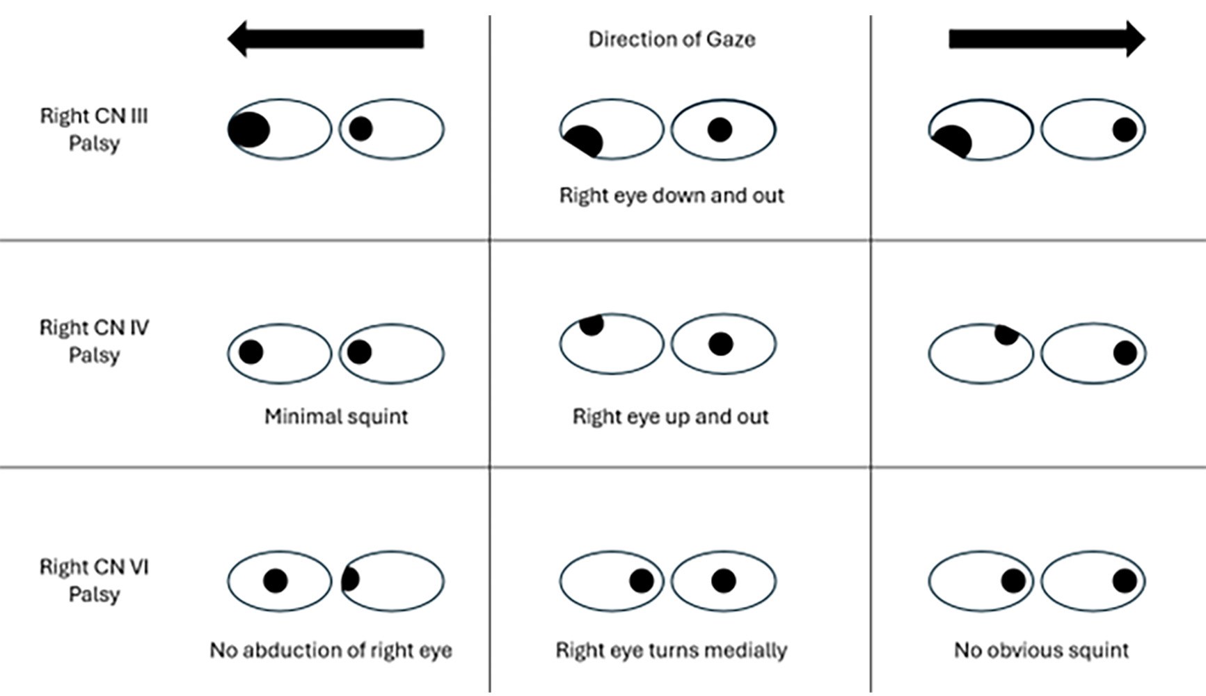 Exam findings with testing of patient extraocular movements with associated unilateral cranial nerve palsies. For bilateral palsies, the abnormal portion of the exam seen in this figure would be duplicated bilaterally. |