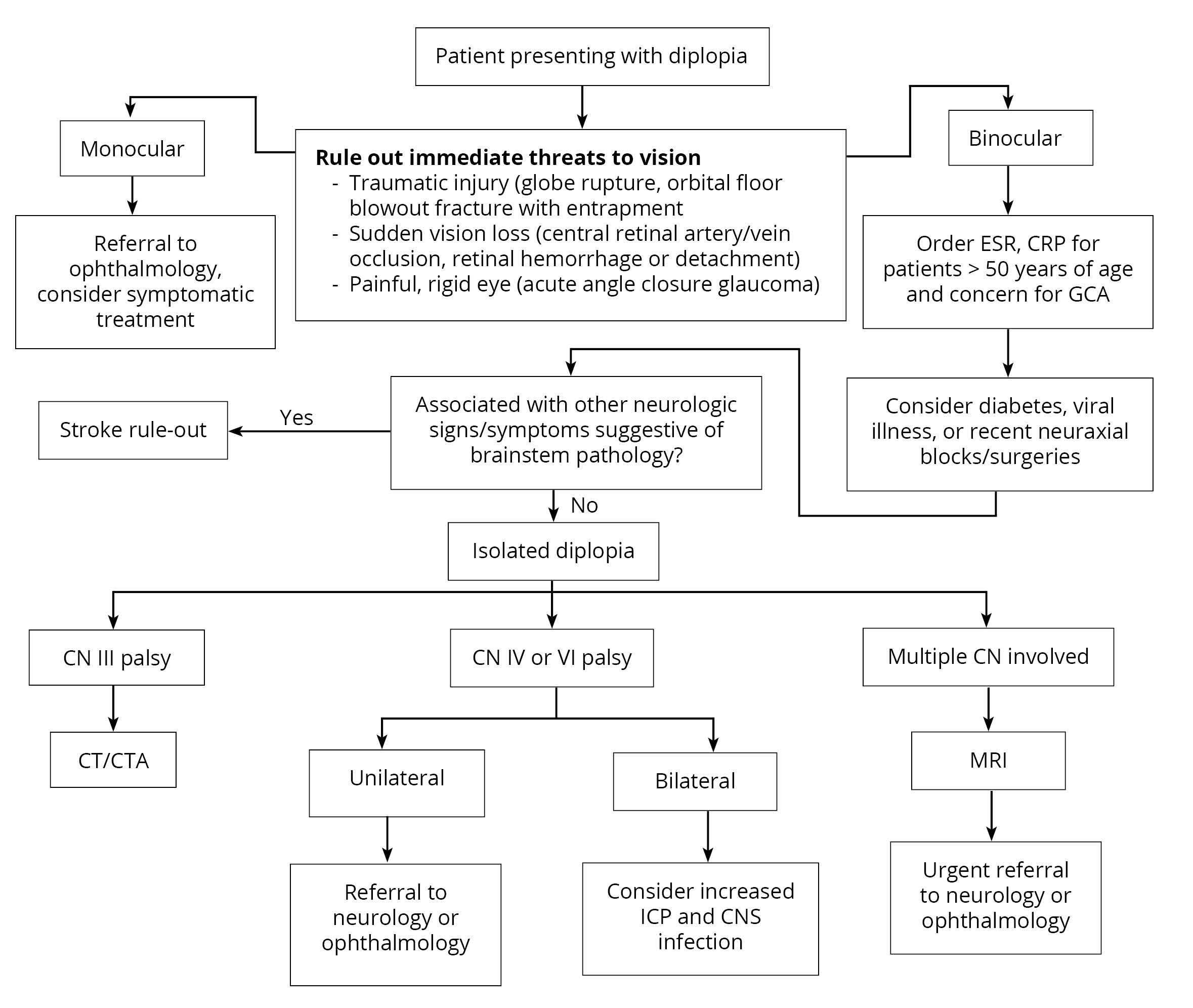 Those found to have binocular diplopia with associated neurologic signs/symptoms should be assessed for potential stroke with CT and CT angiogram (CTA) as well as MRI. If these patients are within a thrombolytic window, consideration should be given to initiating thrombolysis. In addition to stroke, consider other diagnoses, such as giant cell arteritis, diabetes, and recent surgery/neuraxial blocks, as potential causes. Red flags here include pain with palpation of the temporal area and elevated inflammatory markers, and suspicion should be greater in older patients (> 50 years of age).